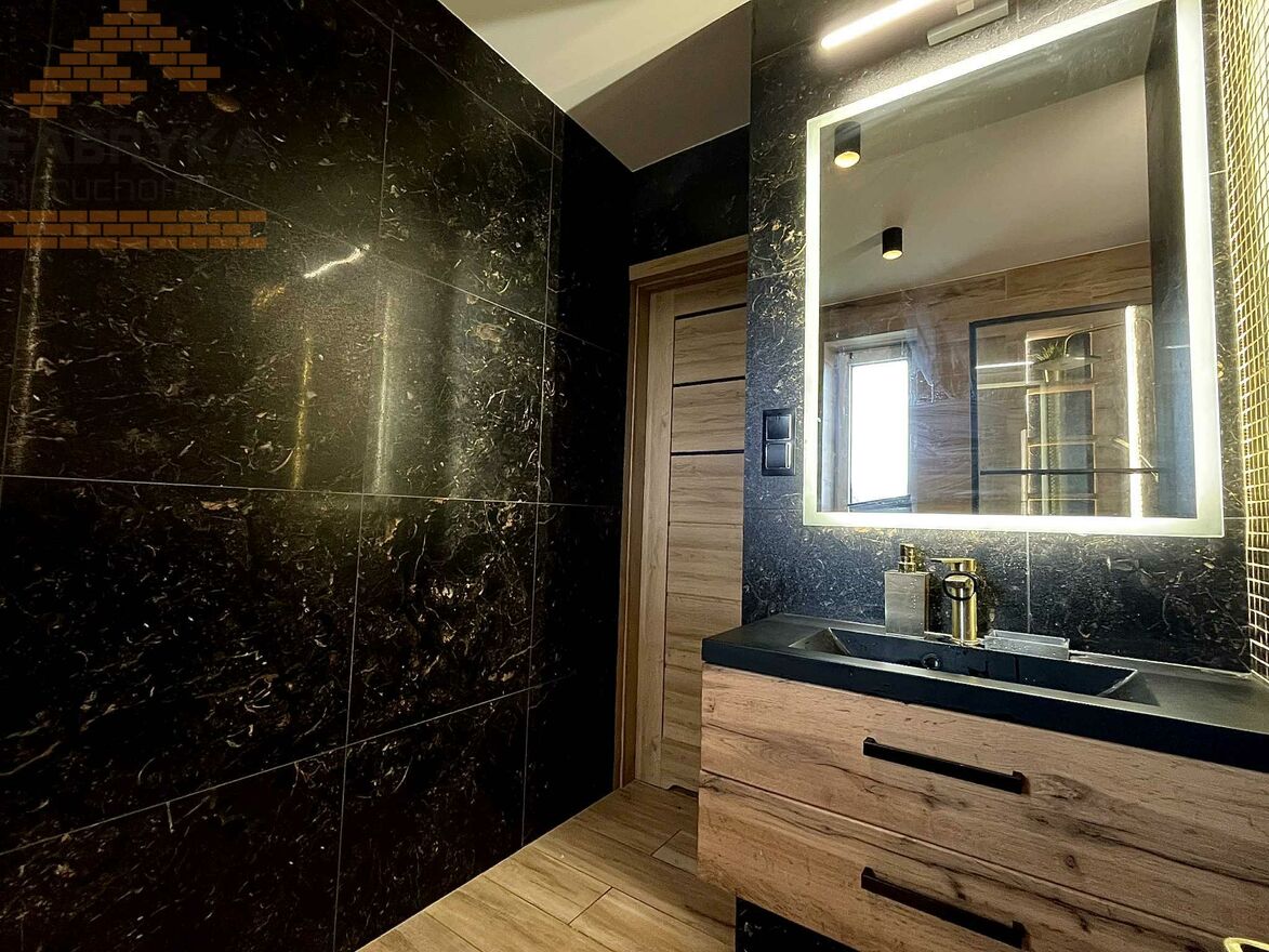piętra: trzech pokoi i dodatkowej łazienki, piwnicy: garażu, pomieszczeń gospodarczych, liczników oraz kotłowni z pompą ciepła. Znajdują się tam także dwa wolne pomieszczenia, które można dowolnie zaadaptować np. na siłownię, spiżarnię lub schowek.